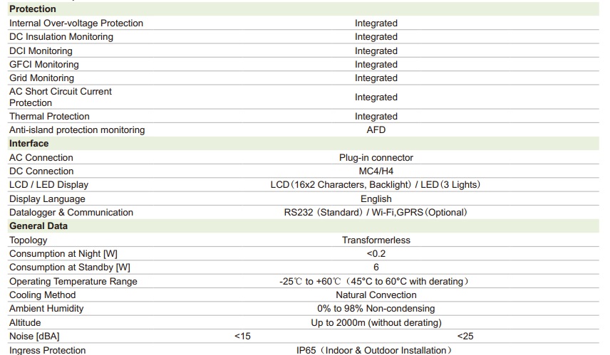 CPS SCJ 1-3kW series PV inverters are applicable to various kinds of residential and commercial rooftops. Compact size, fanless design and comprehensive protection raise the reliability of the PV system and ensure the generation yield is stable for customers in the long run. The Max. conversion efficiency of the product reaches up to 97.2%; Euroefficiency is 96.8% and MPPT efficiency is 99.5%. Integrated DC switch is optional for CPS SCJ 1-3kW series PV inverters. Multiple communication methods are also available to enhance the safety and communication capabilities of CPS SCJ 1-3kW series inverters.